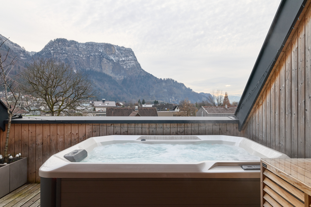Eines der vielen Highlights ist die ca. 20 m² große Loggia mit Whirlpool – mit herrlichem Blick auf den Karren. Hier lässt sich Entspannung auf höchstem Niveau genießen.