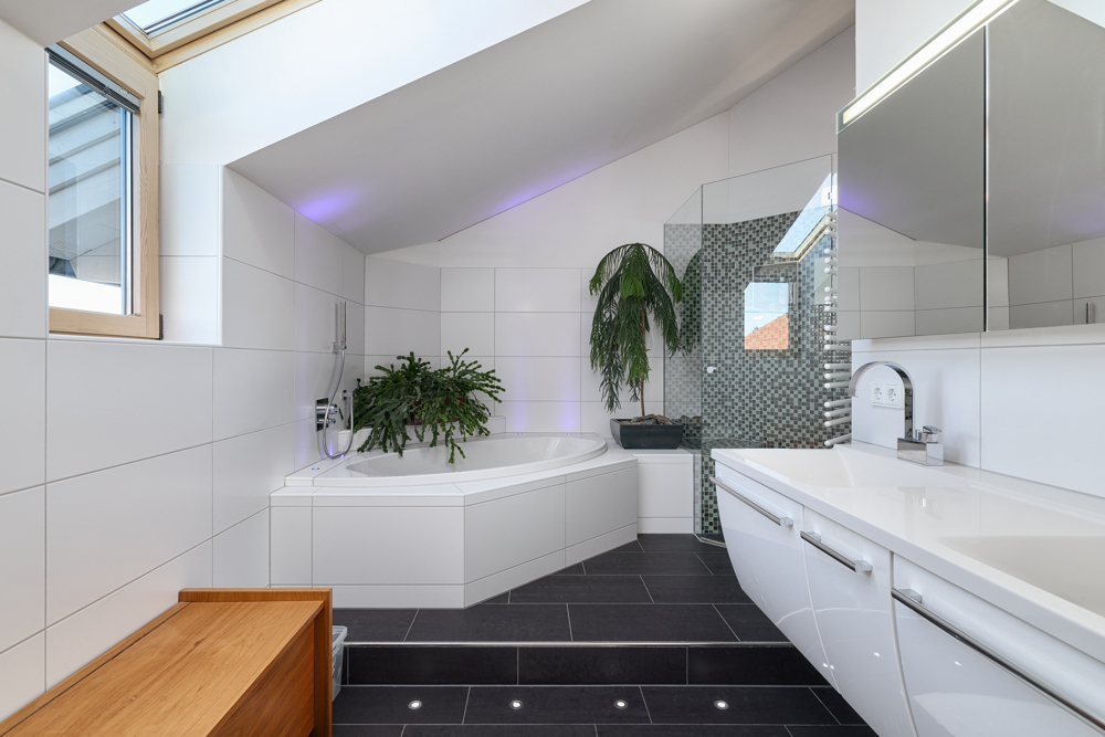 - Doppelwaschtisch, Badewanne, Gäste-WC, Fenster, Eckbadewanne, Whirlpoolwanne