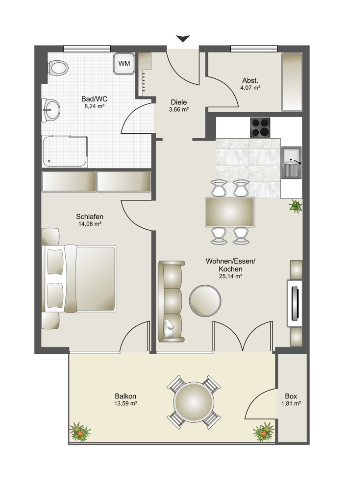 • Grosszügige Terrasse mit Zugang vom Wohn- und Schlafzimmer• Lichtdurchfluteter, offener Wohn- und Essbereich mit moderner Küche